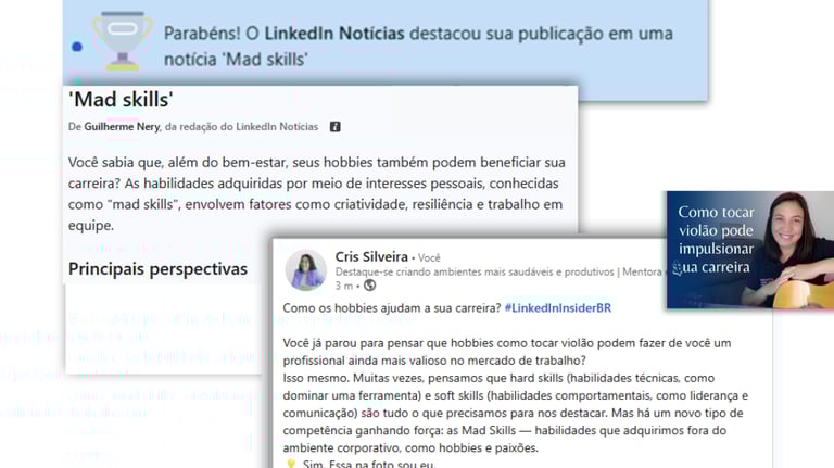 Contribuições para o LinkedIn Notícias, com destaque para os conteúdos "Mad Skills - como os hobbies ajudam a sua carreira" e "Existe trabalho perfeito?"